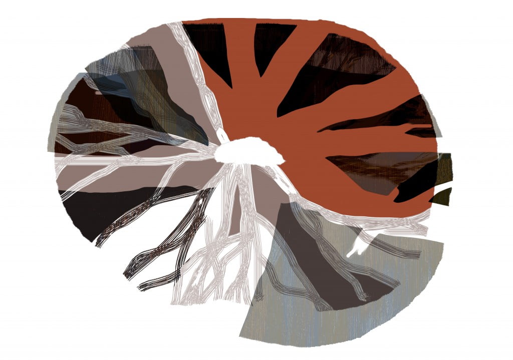 Met deze tekeningen probeerde ik het abstracte begrip boomspiegel te verbeelden. Tegelijk wilde ik het concrete van wortels, stammen, takken, water en zonlicht steeds in hetzelfde beeld vangen.