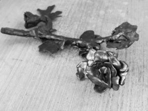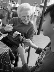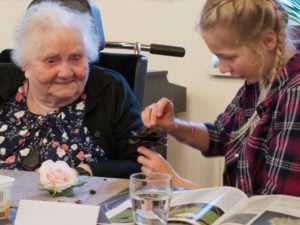 De sfeer is heel anders dan met de vorige bewoners, die bijna allemaal hoogbejaard zijn. Het vormen met was is ook in deze groep een flinke uitdaging. Eerst een plukje was warm maken in de handpalm, dan rustig kneden tot het zacht genoeg is om te verwerken. Een beginnetje maken door een bolletje goed aan de tak te kneden. Daaraan vast de bloemblaadjes. Rozen zijn favoriet. ‘Roosje m’n Roosje, dat is een liedje’. Ik stimuleer ze om de plaatjes en de bloemen op tafel te gebruiken als inspiratiebron en als houvast, maar niet als dwingend voorbeeld, zodat de eigen fantasie een kans krijgt. De kinderen nemen veelal het voortouw, maar de bewoners laten zich ook niet onbetuigd. Meeldraden ‘voor het stuifmeel’, een stamper in het midden en bladeren langs de steel ‘dat is wel uniek, hè?’ en soms doornen.