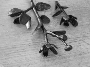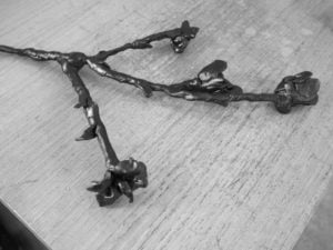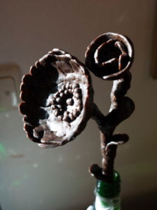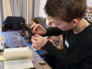 J. zat eigenlijk klaar om te gaan vissen, maar er lag nog een restje ijs op de vijver, dus dat ging niet door. Hij gaat zitten, pakt wat onwennig een stukje was en probeert een plat klaverblad. Daar kijkt hij een tijdje tevreden naar. Dan buigt hij de hoeken om en er ontstaat een ruimtelijke vorm. Hij krijgt er lol in, ontdekt opgetogen dat hij dit goed kan. Blaadje voor blaadje bouwt hij zorgvuldig op tot hij een grote tros heeft gecreëerd, langs de hele lengte van de tak die als steel dient. Tegelijkertijd maakt hij grapjes met A, de leerlinge naast hem.