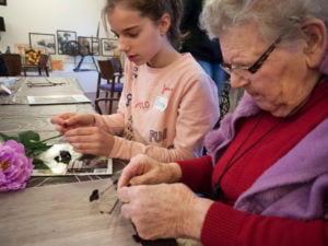De derde en laatste groep is aan de beurt. Op tafel staan kleurige boeketten, er liggen tuinbladen en flora’s en voor elk duo ligt er er een placemat klaar met wat boetseerwas en een takje Acht nieuwe leerlingen vormen duo’s met acht nieuwe bewoners, deze keer hoofdzakelijk mannen, niet allemaal zo oud, wel met geheugenproblemen.