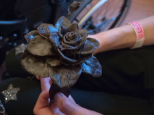 Meneer B. kwam moeilijk uit bed, maar eenmaal gearriveerd geniet hij zichtbaar en omkleedt alle gebeurtenissen met prachtige, bloemrijke formuleringen. Hij zou de bloem (‘een rode roos’) het liefst op het graf van zijn vrouw leggen om dit met haar te delen. We vinden vast wel tijd om een extra bloem voor haar te maken.