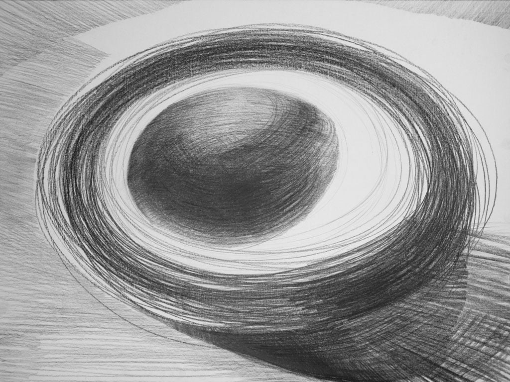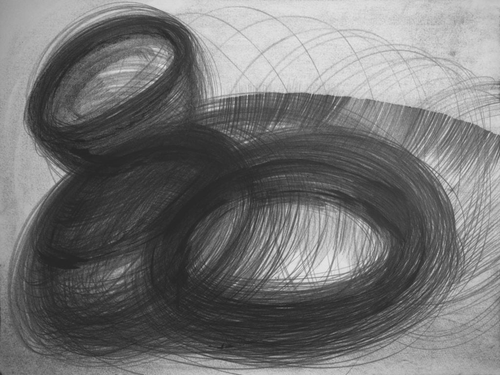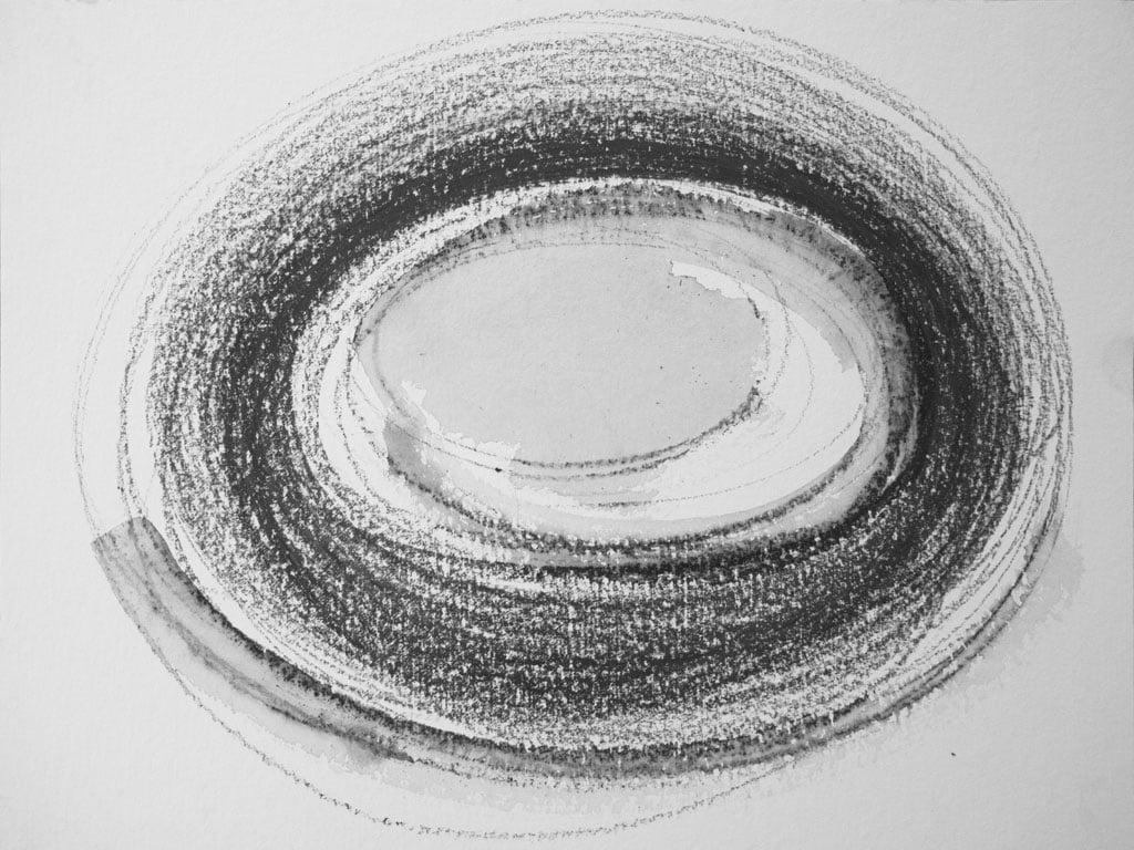 Ik heb net zo lang een ellips op dezelfde plaats getekend tot het papier kapot ging. Dat duurde best lang, ongeveer een uur, met een niet te zachte grafietstift (2B) op 180 grams normaal tekenpapier. Eerst werd het papier gewoon fijnkorrelig zwart, daarna steeds dunner en gladder. Het rekte een beetje uit, ging bobbelig hol staan op de plaats van de herhaalde lijnen, alsof ik een schaal aan het maken was. Dat maakte het lastiger om in de juiste curve te blijven tekenen. Daarna gebeurde er heel lang niet veel bijzonders. De ellips was en bleef glanzend zwart, als metaal. Het werd saai. Ik moest mezelf dwingen tot concentratie, anders raakte mijn hand van het spoor af. Nergens anders aan denken.