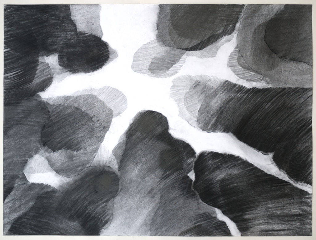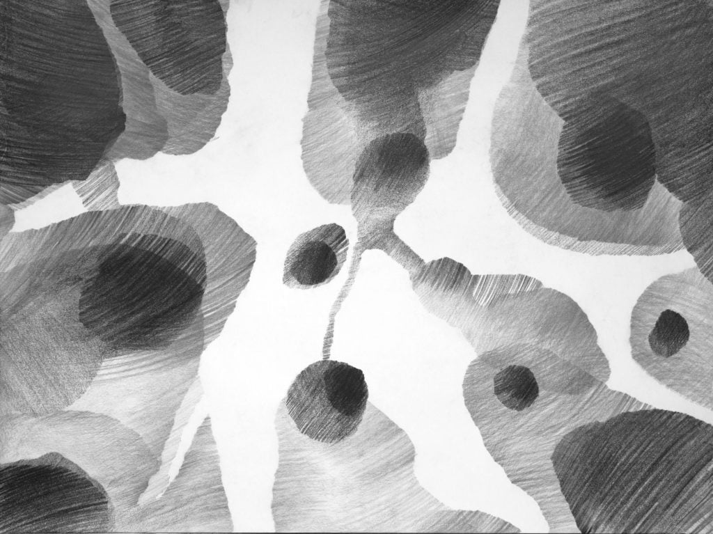 Tot ik rechtsboven eindelijk iets zag veranderen: de grafietlaag ging craqueleren. Een paar keer struikelde mijn hand in een klein barstje, gleed weg en maakte afwijkende krabbels naar het midden. Toen ging het sneller: mijn grafietstift trok smalle snippers papier los en maakte in de volgende ronden de ontstane witte plekken vanzelf weer zwart. Het papier werd rafelig. Tenslotte scheurde het dan toch echt helemaal door.