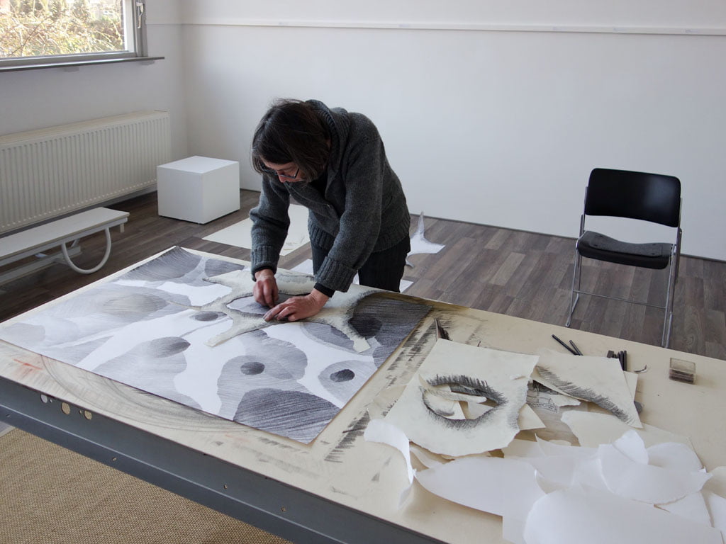 Ook het papier roept nieuwe mogelijkheden op. Alles verandert steeds onder mijn handen. Tijdens het werken bedenk ik welke kant ik op wil. Zoals je tijdens een wandeling zomaar een pad kunt inslaan zonder dat je weet waar het naartoe leidt. Van tevoren heb je wel bedacht welke richting je op wilt, maar niet precies welke route je gaat volgen. Zo teken ik vanuit een globaal plan. Wat het eindresultaat wordt weet ik zelf dan nog niet. Dat is spannend en inspannend tegelijk.