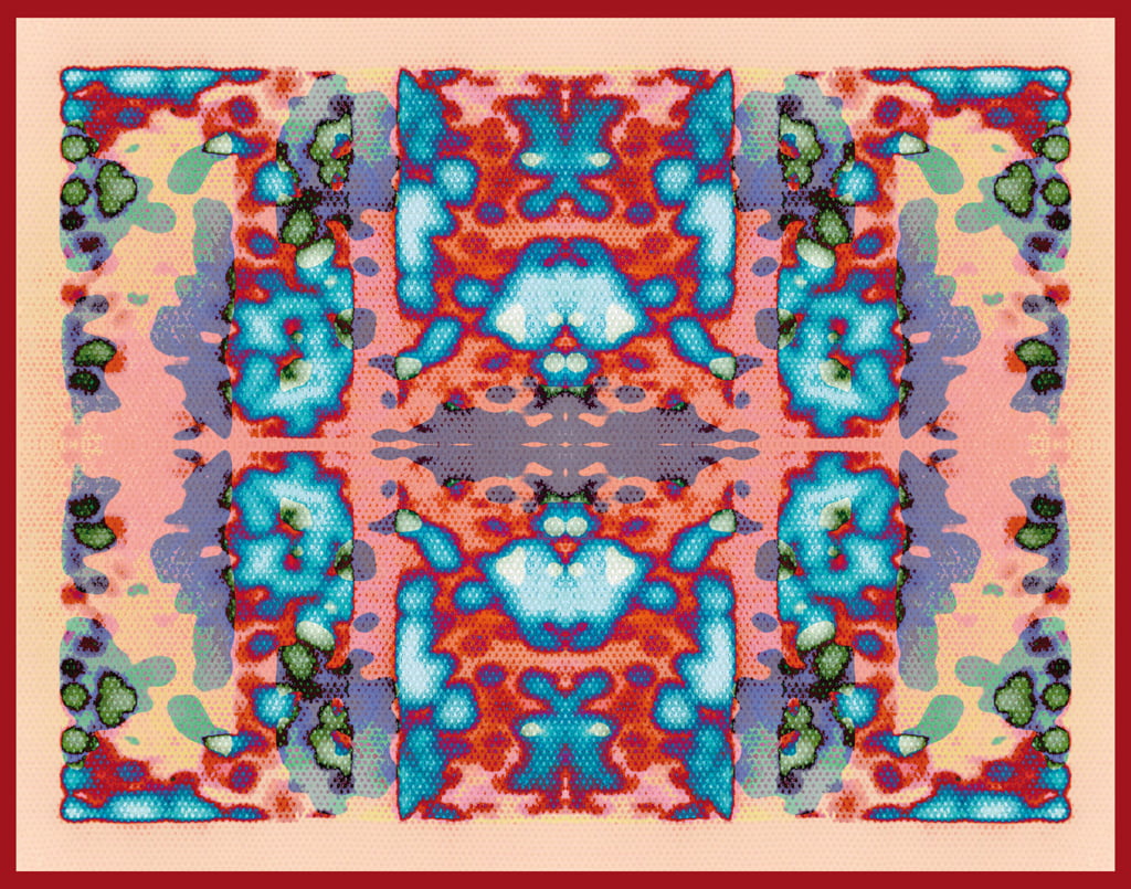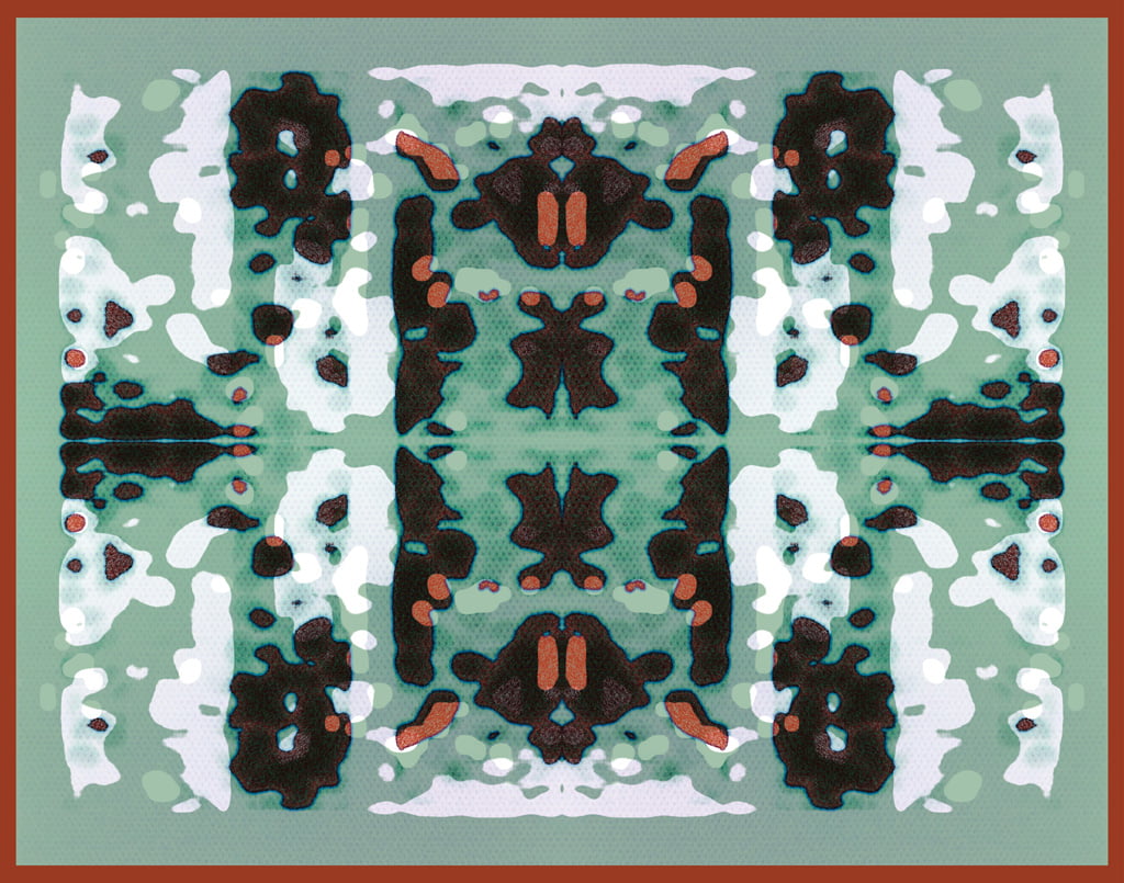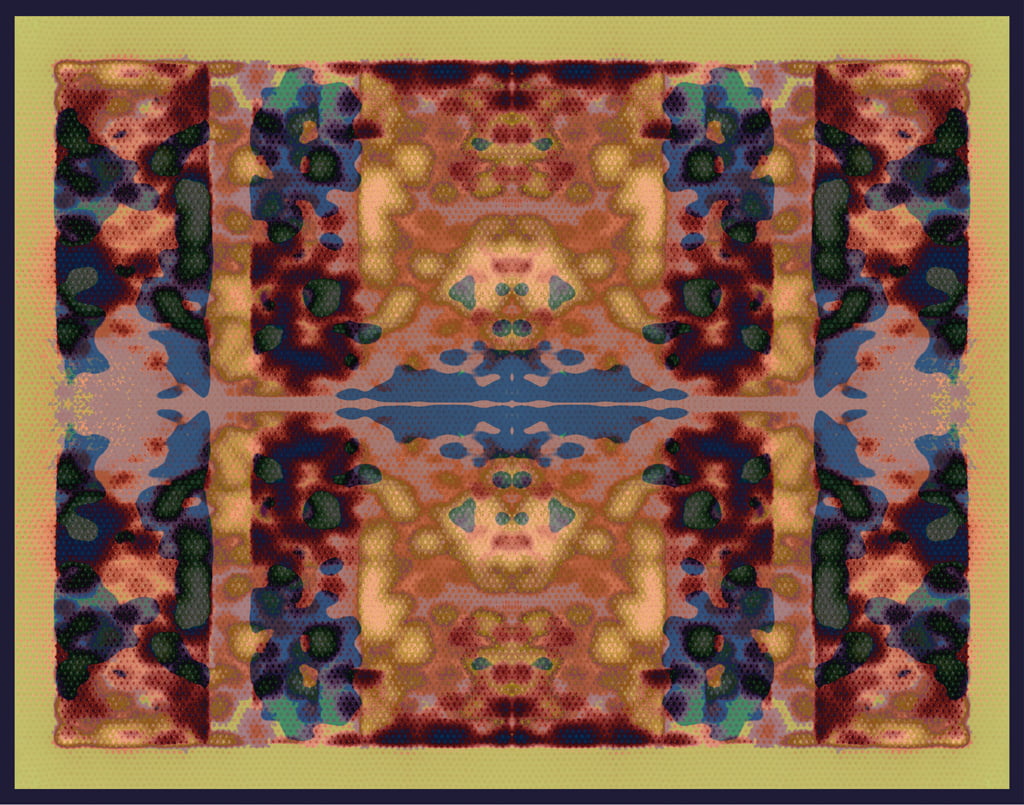 Daarna combineerde ik vier gespiegelde of gedraaide beelden en omlijnde de rechthoek. Het zouden oosterse tapijten kunnen zijn, of deurmatten. Waar weer zonlicht overheen kan schijnen…