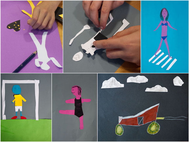 Daarna knippen ze mensfiguurtjes uit papier en zetten deze in een houding door de ledematen bij de gewrichten te vouwen of los te knippen en en te verdraaien. Inmiddels zijn ze alweer vergeten hoe lang de armen en benen zijn ten opzichte van de romp. tenslotte krijgen de figuurtjes gezichtjes, haar, kleren en een omgeving.