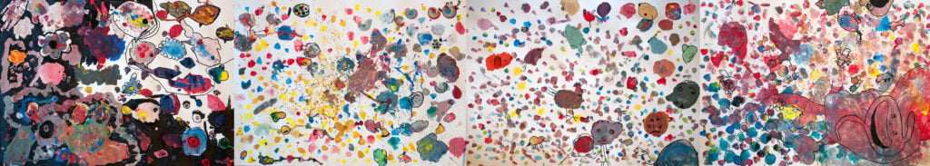 We gaan om de grote vellen met verfvlekken op de grond zitten. Met een variant op het spelletje ‘ik zie ik zie wat jij niet ziet’ zoeken we dieren, mensen en dingen in de vlekken.