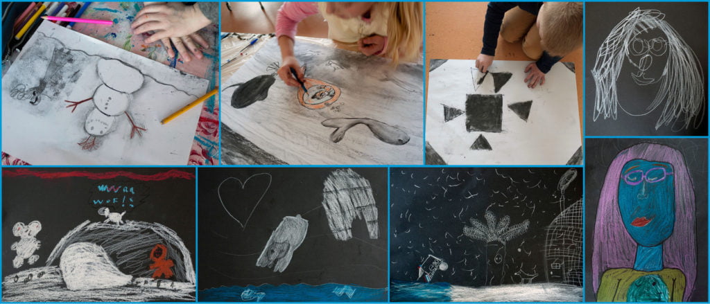 Opnieuw is de groep druk en verschillende kinderen willen graag naar buiten. De sneeuw is goeddeels gesmolten, maar de zon schijnt zo heerlijk. Ik begrijp het wel. Maar we gaan tóch tekenen. De sneeuw, ‘vanmorgen toen je buiten kwam’. Met houtskool op wit of met wit krijt en kleurpotlood op zwart. Ik laat zien hoe je een vorm rond kunt laten lijken door de houtskool ietsje uit te vegen, en hoe je lichte delen naar voren kan laten komen. De concentratie is niet optimaal. Toch is het resultaat voor mij een verrassing.