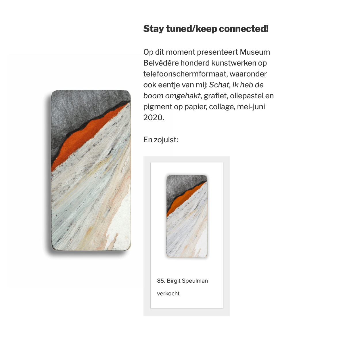 Op dit moment presenteert Museum Belvédère honderd kunstwerken op telefoonschermformaat, waaronder ook eentje van mij: Schat, ik heb de boom omgehakt, grafiet, oliepastel en pigment op papier, collage, mei-juni 2020.